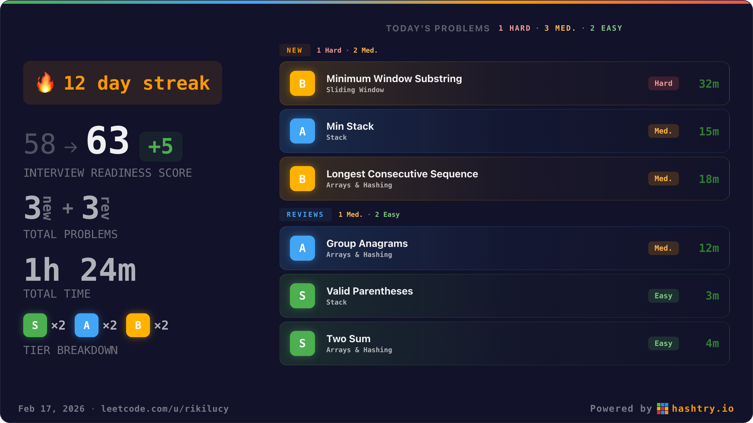 A number from 0 to 100 based on five signals: solution quality, topic coverage, solve speed, self-assessment accuracy, and consistency. It measures your list completion readiness — not a guarantee of interview outcome.